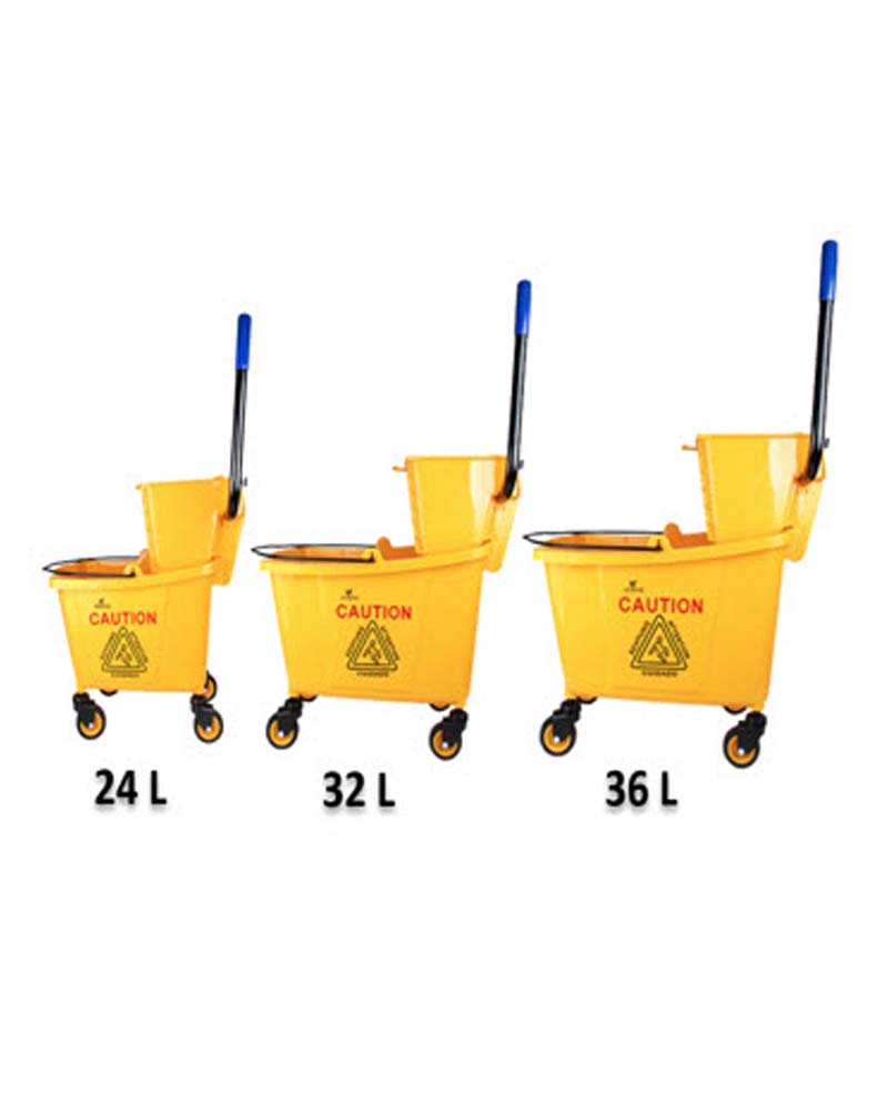 ชุดถังบีบม๊อป (Mop Bucket and Wringer set) หรือถังบีบม๊อปถูพื้นสีเหลืองมีล้อเข็นช่วยให้การทำความสะอาดเป็นเรื่องง่ายๆ ด้วยการทำความสะอาดพื้นด้วยม็อปเปียกและสะดวกมากขึ้นด้วยถังน้ำที่สามารถเข็นไปได้ทุกที่ และอีกทั้งยังสามารถบีบผ้าม็อปให้หมาดได้ง่ายๆเพียงกดคันโยก ล้อเข็น ระบบลูกปืน 360 องศา สะดวกในการเคลื่อนย้ายผลิตจากพลาสติกคุณภาพสูง ทนทาน มือจับหุ้มยางถนอมมือพร้อมคันโยกสำหรับบีบผ้าม็อบ ใช้ง่าย ประหยัดแรง ล้อ PVC ขนาด 3 นิ้ว แข็งแรงทนทาน ไม่เป็นสนิม ระบบสปริงบีบผ้า ลดการใช้แรง ช่วยให้ผ้าม็อปสะอาด และ หมาดได้อย่างง่ายดาย ขนาด 20L ,24L ,32L และ36L